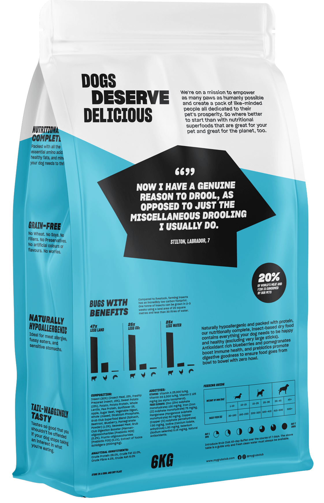 Insect (30%) (Insect Meal, 15%, Freshly Prepared Insect, 15%), Sweet Potato (15%), Potato, Potato Protein, Whole Lentils, Pea Protein, Sunflower Oil, Apple, Sugar Beet, Vegetable Digest, Whole Linseed, Dicalcium Phosphate, Grub Club Superfood Blend (Spinach, Beetroot, Blueberry, Pomegranate Powder) (1.0%), Seaweed Meal, Grub Club Digestion Booster (Mannan-oligosaccharides [Prebiotic MOS] (0.2%), Fructo-oligosaccharides [Prebiotic FOS] (0.1%), Extract of Yucca Schidigera (200mg/kg).