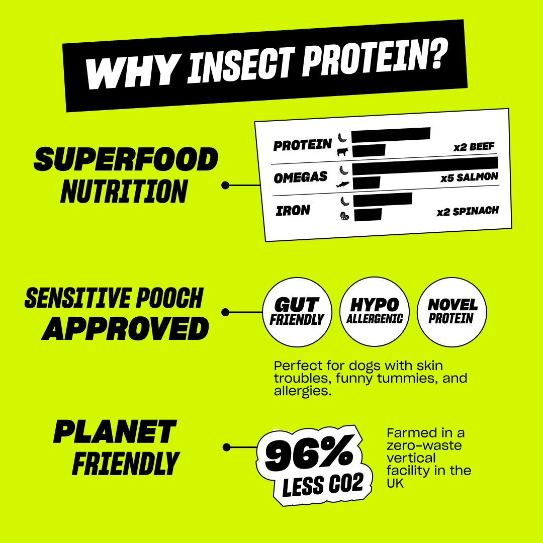 Insect Meal 20%, Sweet Potato Flour, Gram Flour, Pea Flour, Potato Flour, Cold Pressed Rapeseed Oil, Dried Apple 2%, Linseed 2%, Minerals, Chicory Extract (FOS) 0.25%, Yucca Extract 0.1%, Oregano, Basil, Sage, Parsley, Thyme, Prebiotics 0.01%