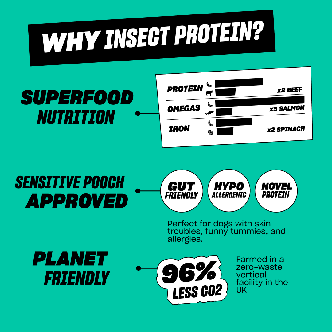 Insect Meal 26%, Pea Flour, Gram Flour, Vegetable Glycerine, Potato Flour, Cold Pressed Rapeseed Oil, GC Energy Complex 4% (Fresh Banana, Fresh Blueberries, Dried Kale, Spirulina), Dried Apple 2%, Linseed 2%, Minerals