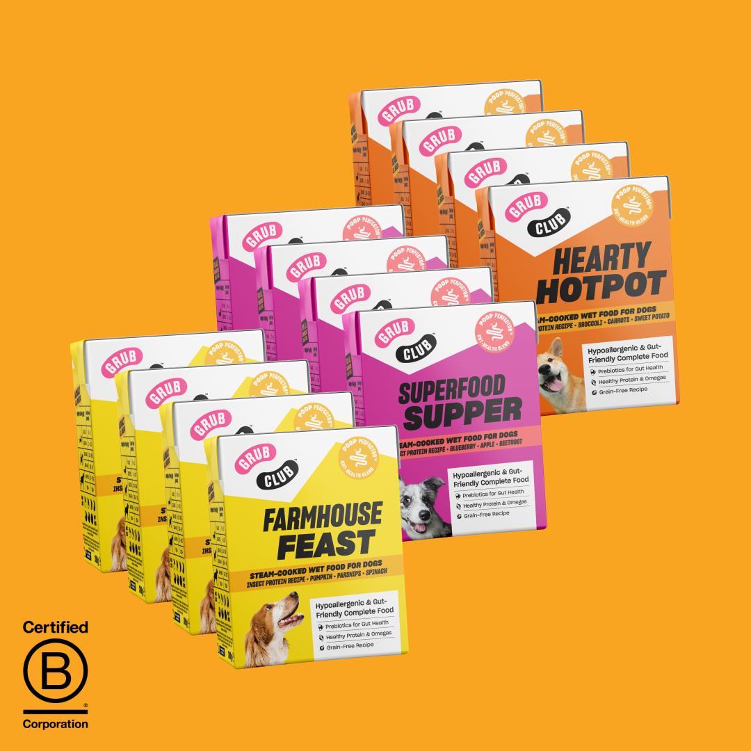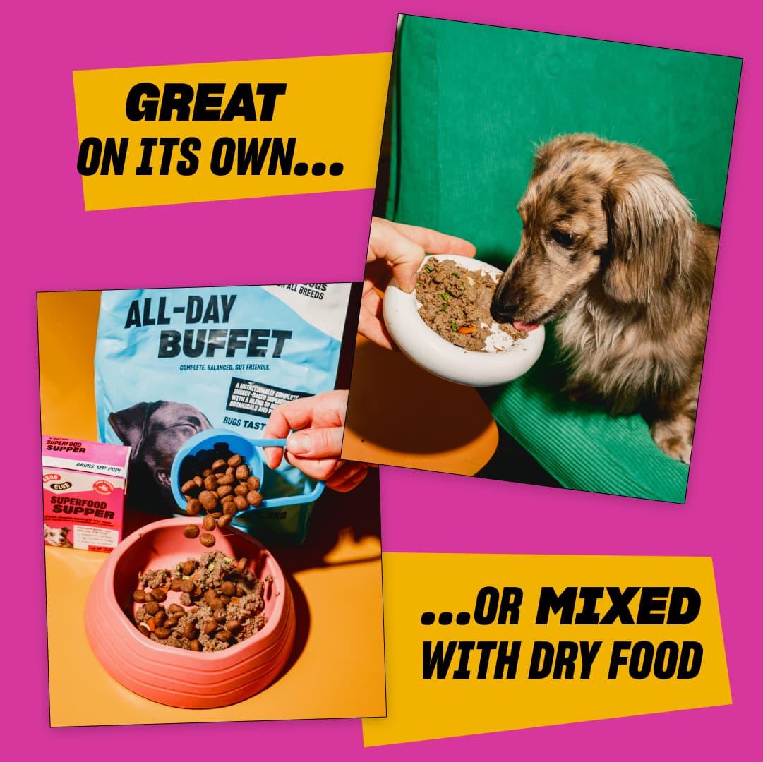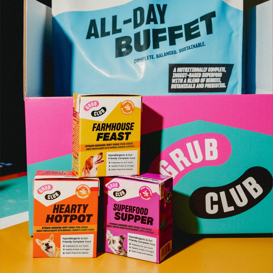 HEARTY HOTPOT: COMPOSITION: Insect 62%, Sweet Potato 4%, Carrot 3.4%, Broccoli 1.3%, Brewers’ Yeast, Milled Linseed, Hemp flour, Chia seed, Parsley, Poop Perfector™ Blend (Prebiotics 0.37%, Yucca Extract 0.0075%) Minerals, Glucosamine, Chondroitin ANALYTICAL CONSTITUENTS: Crude Protein: 10%, Crude Fat: 10%, Crude Fibre: 3.5%, Crude Ash: 1.5%, Moisture: 71%, Omega-3: 0.15%, Omega-6: 1.4%, Omega-9: 1.6% 124 Kcal ME/100g NUTRITIONAL ADDITIVES: Vitamin A 3600IU, Vitamin D3 300IU, Iron (as Iron (II) Sulphate Monohydrate) 14.4mg, Copper (as Copper (II) Sulphate Pentahydrate) 1.4mg, Manganese (as Manganous Sulphate Monohydrate) 2.4mg, Zinc (as Zinc Sulphate Monohydrate) 30mg FARMHOUSE FEAST: COMPOSITION: Insect 61.7%, Pumpkin 4%, Parsnip 2.7%, Spinach 2.7%, Brewers’ Yeast, Milled Linseed, Hemp flour, Chia seed, Sage 0.1%, Poop Perfector™ Blend (Prebiotics 0.37%, Yucca Extract 0.0075%) Minerals, Glucosamine, Chondroitin ANALYTICAL CONSTITUENTS: Crude Protein: 10%, Crude Fat: 10%, Crude Fibre: 3.5%, Crude Ash: 1.5%, Moisture: 71%, Omega-3: 0.15%, Omega-6: 1.4%, Omega-9: 1.6% 124 Kcal ME/100g NUTRITIONAL ADDITIVES: Vitamin A 3600IU, Vitamin D3 300IU, Iron (as Iron (II) Sulphate Monohydrate) 14.4mg, Copper (as Copper (II) Sulphate Pentahydrate) 1.4mg, Manganese (as Manganous Sulphate Monohydrate) 2.4mg, Zinc (as Zinc Sulphate Monohydrate) 30mg SUPERFOOD SUPPER COMPOSITION: Insect 61.7%, Beetroot 4%, Apple 2.7%, Blueberry 2.7%, Brewers’ Yeast, Milled Linseed, Hemp flour, Pomegranate, Poop Perfector™ Blend (Prebiotics 0.37%, Yucca Extract 0.0075%) Minerals, Glucosamine, Chondroitin ANALYTICAL CONSTITUENTS: Crude Protein: 10%, Crude Fat: 10%, Crude Fibre: 3.5%, Crude Ash: 1.5%, Moisture: 71%, Omega-3: 0.15%, Omega-6: 1.4%, Omega-9: 1.6% 124 Kcal ME/100g NUTRITIONAL ADDITIVES: Vitamin A 3600IU, Vitamin D3 300IU, Iron (as Iron (II) Sulphate Monohydrate) 14.4mg, Copper (as Copper (II) Sulphate Pentahydrate) 1.4mg, Manganese (as Manganous Sulphate Monohydrate) 2.4mg, Zinc (as Zinc Sulphate Monohydrate) 30mg