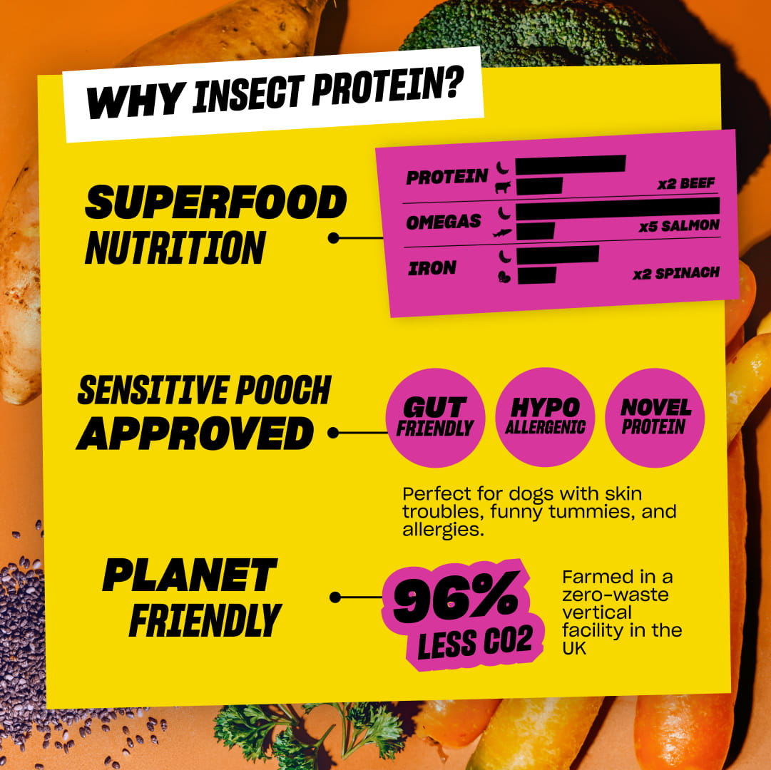 Insect 62%, Sweet Potato 4%, Carrot 3.4%, Broccoli 1.3%, Brewers’ Yeast, Milled Linseed, Hemp flour, Chia seed, Parsley, Poop Perfector™ Blend (Prebiotics 0.37%, Yucca Extract 0.0075%) Minerals, Glucosamine, Chondroitin