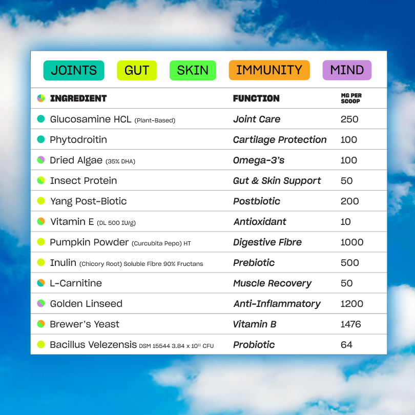 Saccharomyces cerevisiae, Products from the processing of plants (Flax Seed Powder); 24%, Products and co-products from processing fresh fruits and vegetables (Pumpkin Fruit Powder); 20%, Inulin (Cichorium intybus); 10%, Glucosamine (from fermentation); 5%, Yeasts Products (Cyberlindnera jadinii, Saccharomyces cerevisiae); 4%, Seaweed Meal (Ulva Lactuca Linnaeus, Fucaceae Fucus Vesiculosus, Hyaluronic acid, Maltodextrin); 2%, Dried Algae (Schizochytrium); 2%, Insect Protien; 1%.